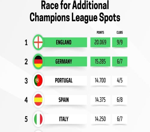 本赛季欧战积分更新:英超断档领先,德甲第2,法甲仅第7